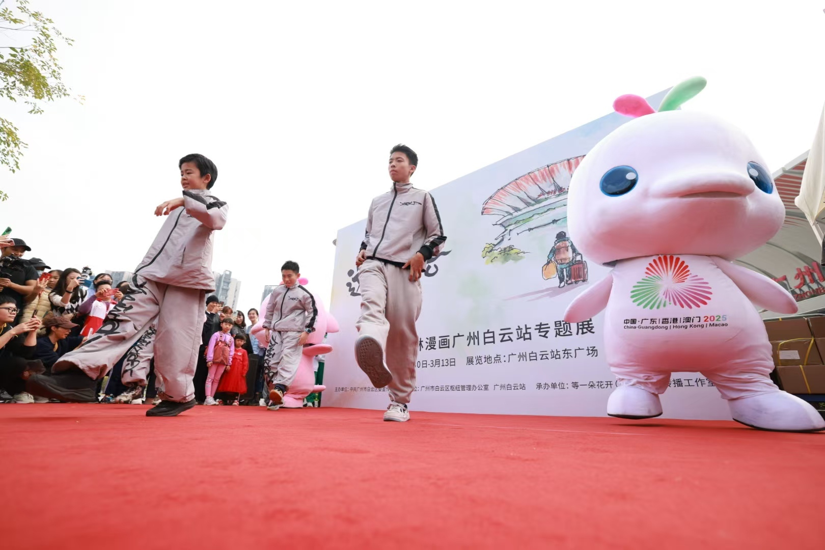 开展现场还举行了广州白云站“策马迎新岁,共赴中国年”大湾鸡快闪活动。下午3点活动拉开帷幕,“大湾鸡”喜洋洋、乐融融专属人偶空降现场,瞬间成为全场焦点。人偶们与观众击掌、拥抱、合影,引得孩子们兴奋追逐。开场节目《激情广州 活力少年》由广州市白云区汇侨第一小学呈现,动感街舞搭配“大湾鸡”人偶的萌趣助演,潮流与IP形象融合,引来阵阵掌声。广州白云站“合唱人”们现场演唱《嘉禾望岗》《海阔天空》《迎春花》等脍炙人口的歌曲,观众挥手跟唱,现场化作一片温暖海洋。